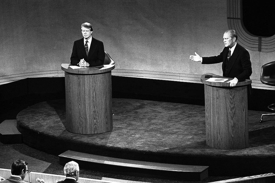 President Gerald Ford faces challenger Jimmy Carter in a debate in Philadelphia, September 23, 1976.