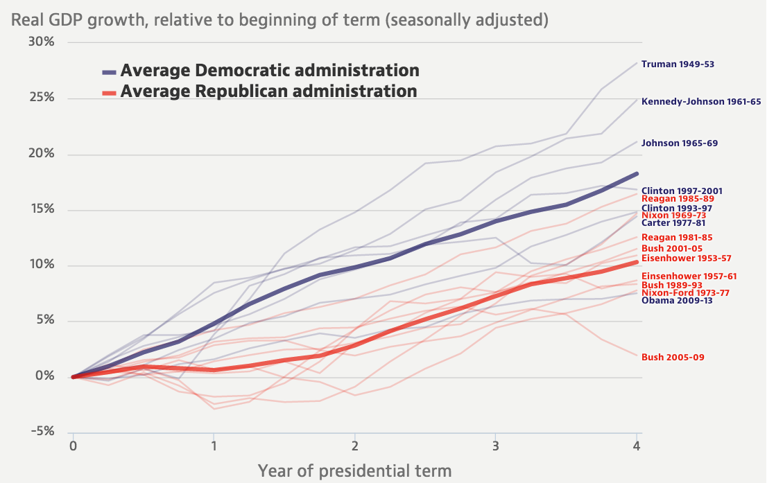 In Presidents and the U.S. Economy: An Econometric Exploration (PDF), authors Alan Blinder and Mark Watson compare the economic records of Republican and Democratic presidential administrations, focusing on the period since World War II when data on gross domestic product and employment have been collected in a consistent manner. They find GDP tends to grow much faster under Democratic presidents (averaging 4.33% per year) than Republican presidents (averaging 2.54% per year).