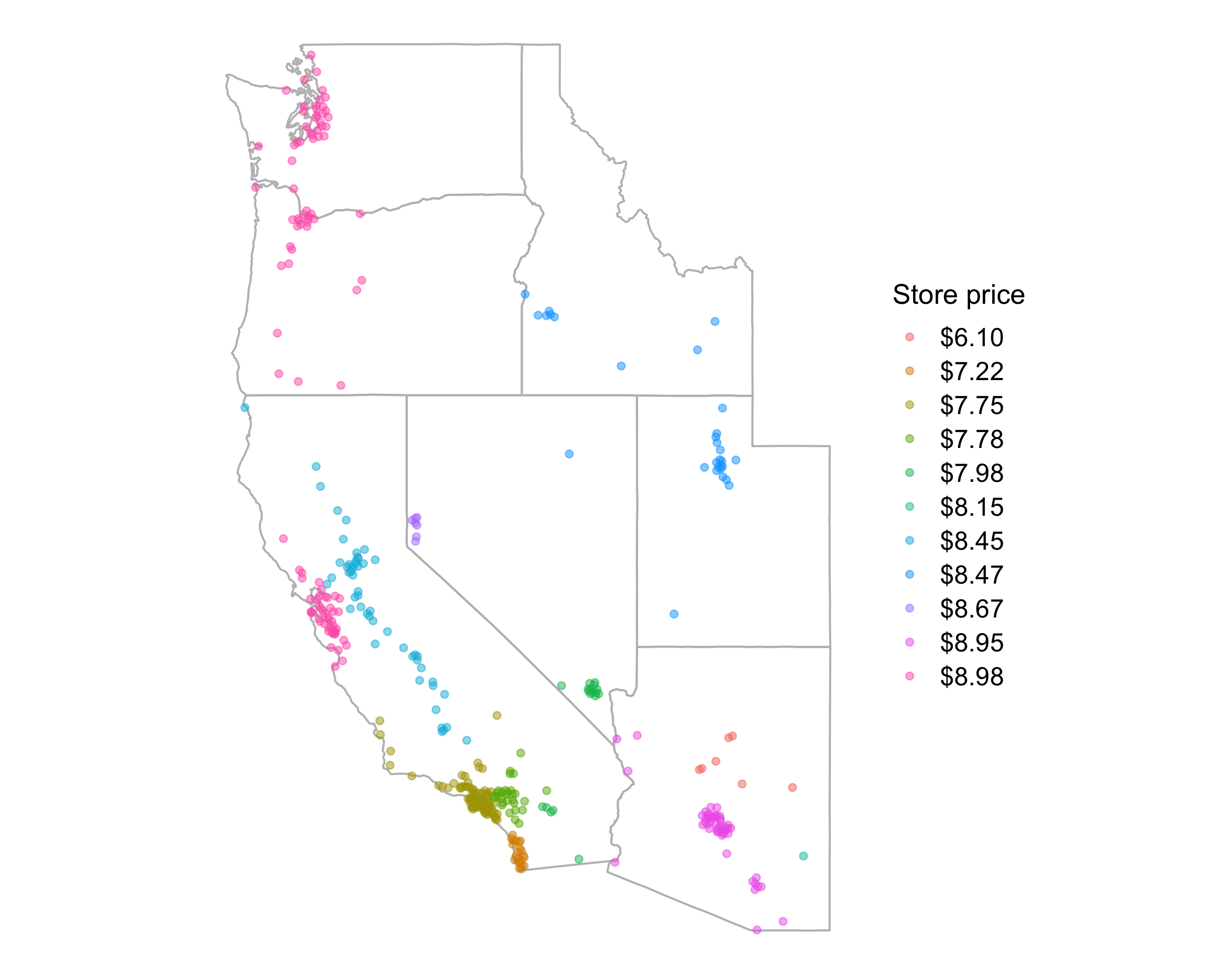 The map below shows Home Depot's store locations and prices of 4′ × 8′ × 1/2′′ drywall in the western US. Zones vary greatly in size and shape, and they can span state lines.